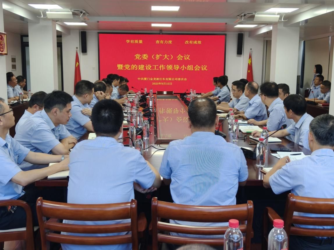 2025年9月15日,金旅客车召开党委(扩大)会议暨党的建设工作领导小组会议,传达学习贯彻习近平总书记关于学习教育的重要指示精神以及中央、省委和上级党组织党的建设工作领导小组会议精神,全面总结公司党委深入贯彻中央八项规定精神学习教育情况,研究部署巩固拓展学习教育成果,锲而不舍落实中央八项规定精神,推进作风建设常态化长效化。金旅客车党委书记、董事长彭东庆主持会议,公司党委委员、中层及以上干部、部分职工代表参加会议。