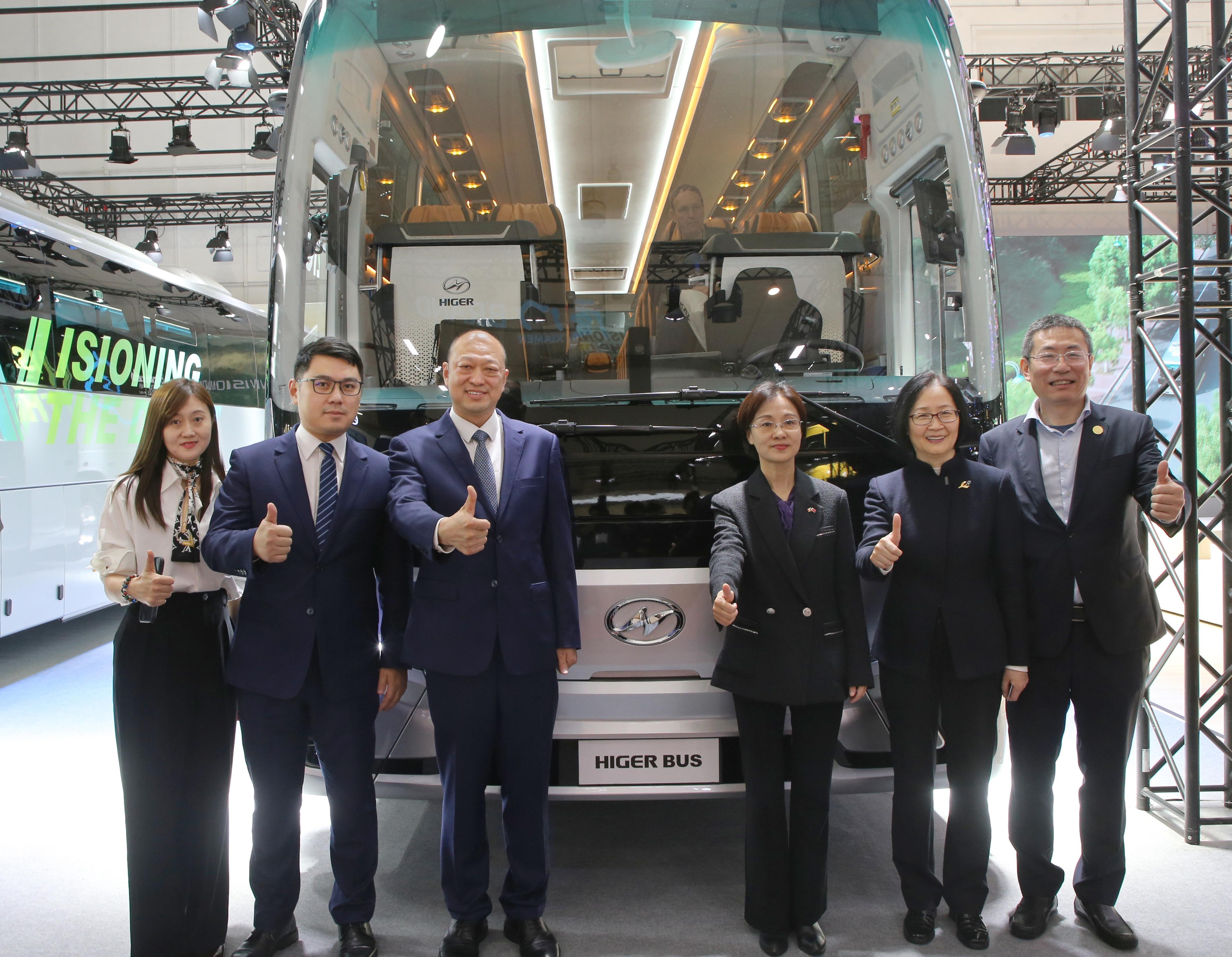 中国驻比利时大使馆临时代办李艳(右三)、商务参赞谢亚静(右二)为海格新V系客车点赞